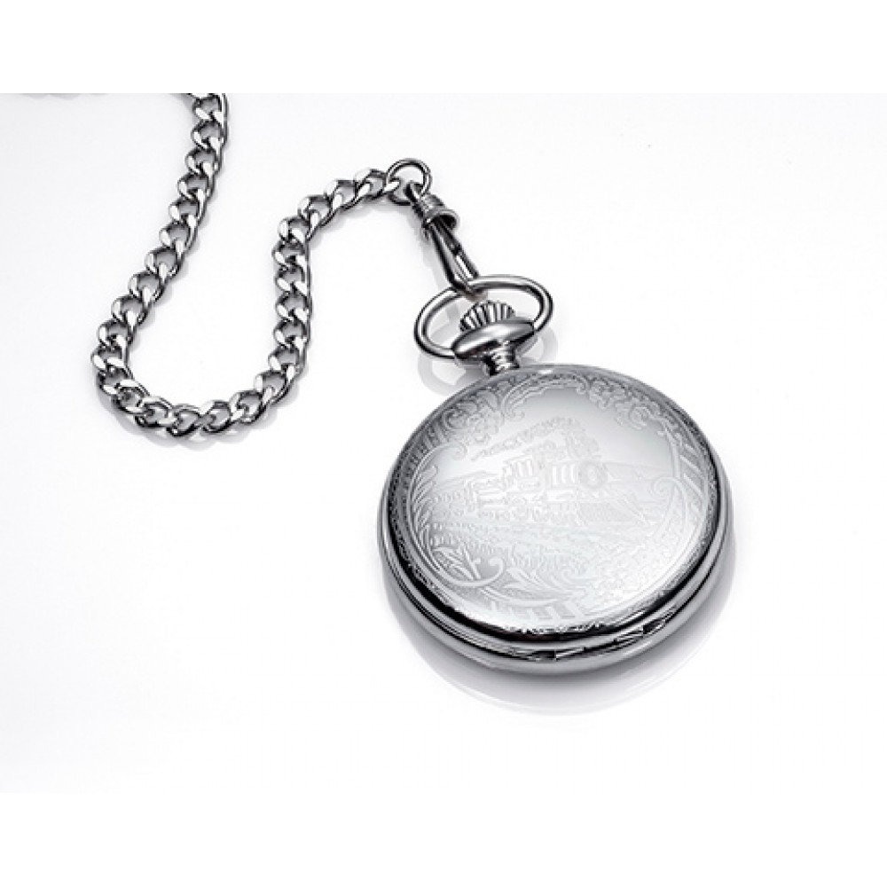 Un reloj de bolsillo para llevar en todo momento. Protegido con una tapa grabada con un dibujo de una máquina de tren. Este Viceroy te hará sentir como un auténtico dandee.