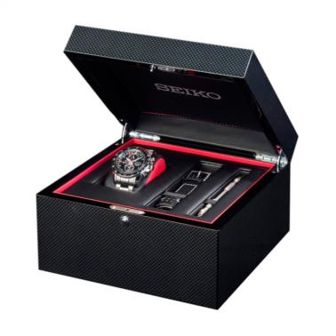 Seiko cada vegada aposta més per la seves línies més especials. Solars, Kinetics i els Automàtics, cada cop tenen més importància per la marca. En aquesta proposta, Seiko presenta una edició limitada de la seva sèrie 5, automàtic. Imponent al canell, mescla l’esportivitat amb un bisell giratori, una esfera de fibra de carboni, que li dóna exclusivitat i una caixa amb PVC negre per fer un rellotge únic. Una edició limitada pels amants dels rellotges.